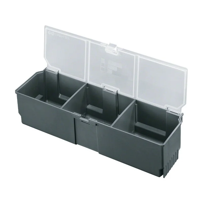 Ящик для хранения Bosch 1600A016CW производится из прочного пластика серого цвета и снабжается прозрачной пластиковой крышкой, благодаря которой пользователь сможет ознакомиться с содержимым отделений, не открывая крышку. Имеющий три отделения вместительный инструментальный бокс станет удобным решением для хранения нескольких единиц мелкого ручного или механизированного инструмента. Наряду с инструментом вы сможете хранить в его отделениях и расходные материалы, крепежные элементы, оснастку для оборудования, фурнитуру и т. д.